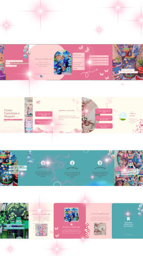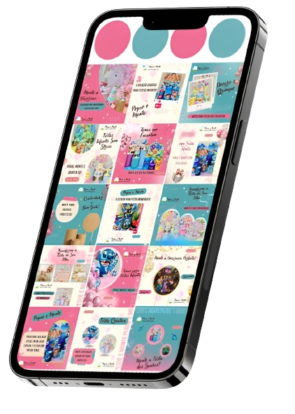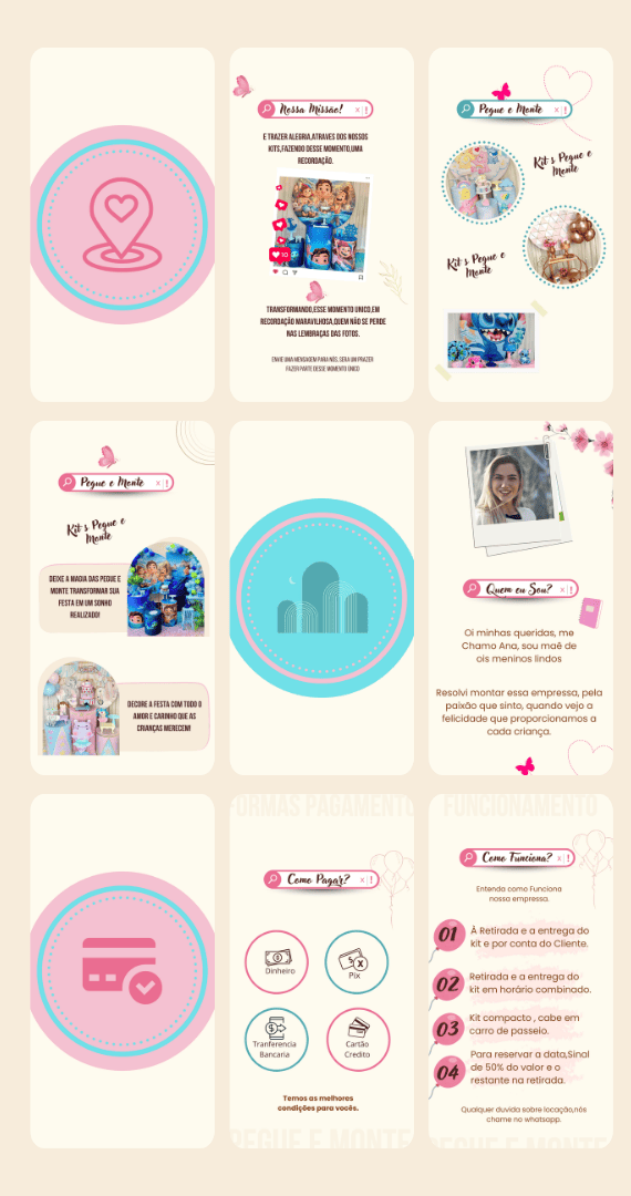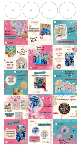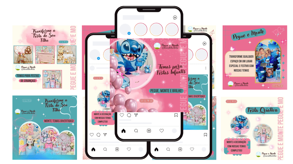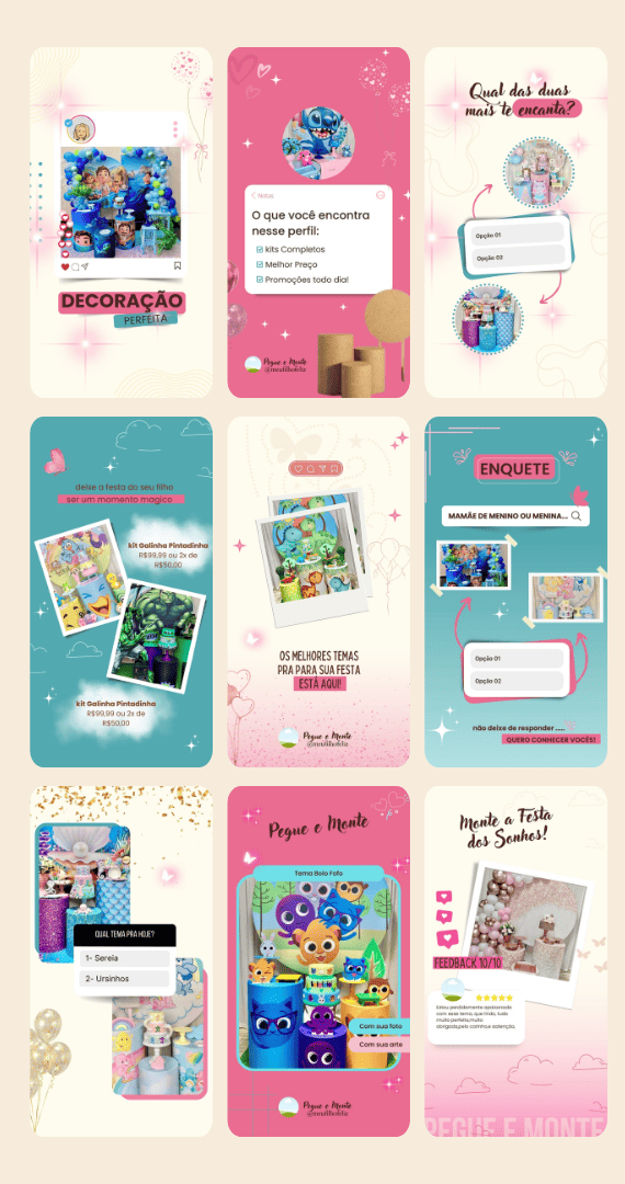 Posts de conteúdo de fotos, dicas e inspirações de festas infantis com pegue e monte